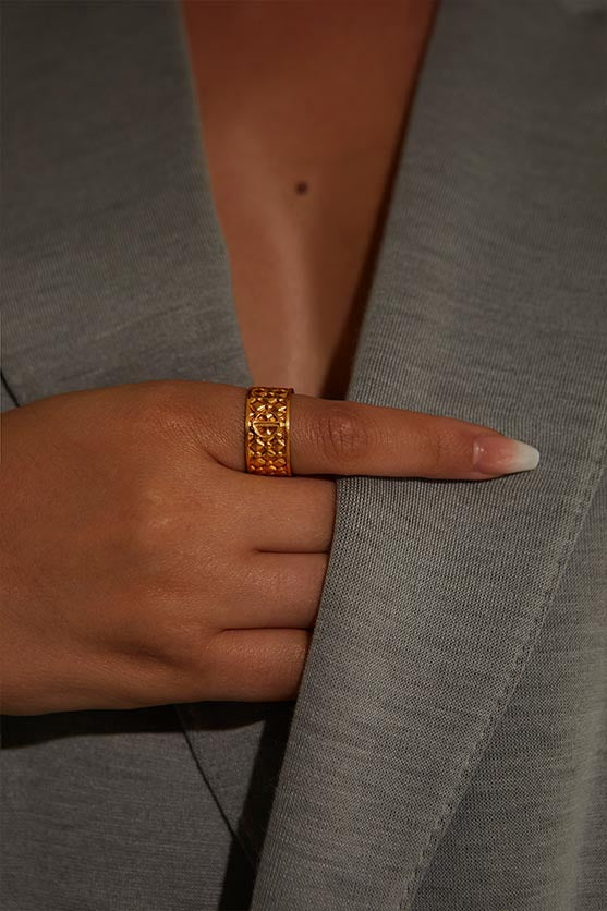 Designing my first ring, which was inspired by quilted leather work, has been crafted with delicate soft gold quilts, reminiscent of intricate Byzantine jewellery.